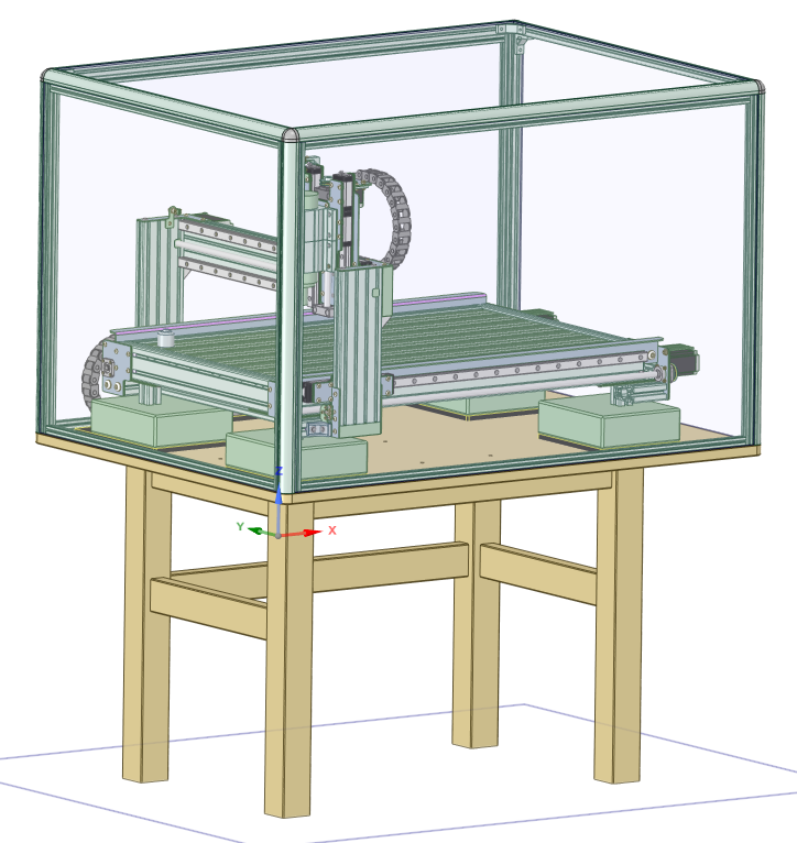 Mounted on the table is an enclosure with removable acrylic panels to keep noise and dust inside.