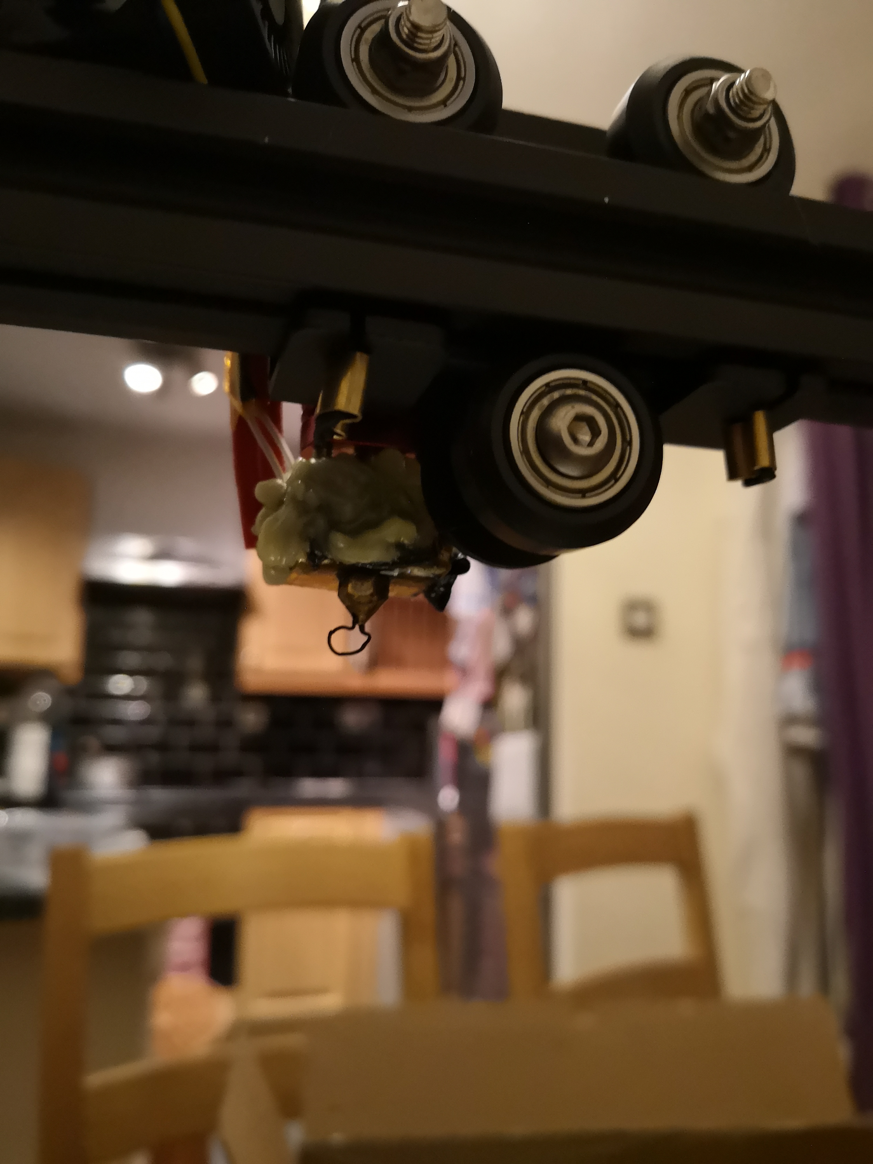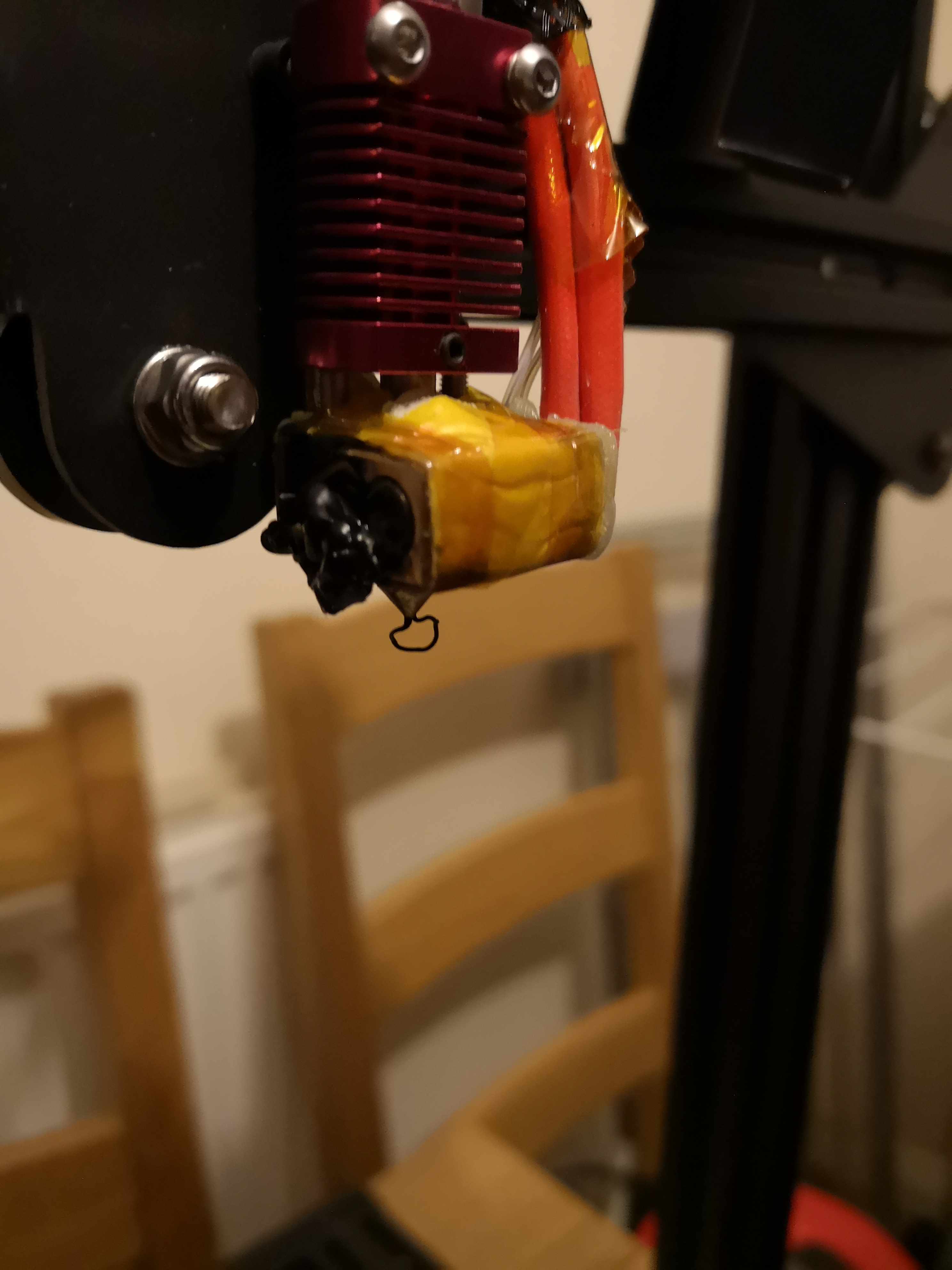 Switched filament (from white to black), before trying to print one of the essential upgrades for the kit, but found a significant amount of melted white filament coming from inside of the box in the hot end.