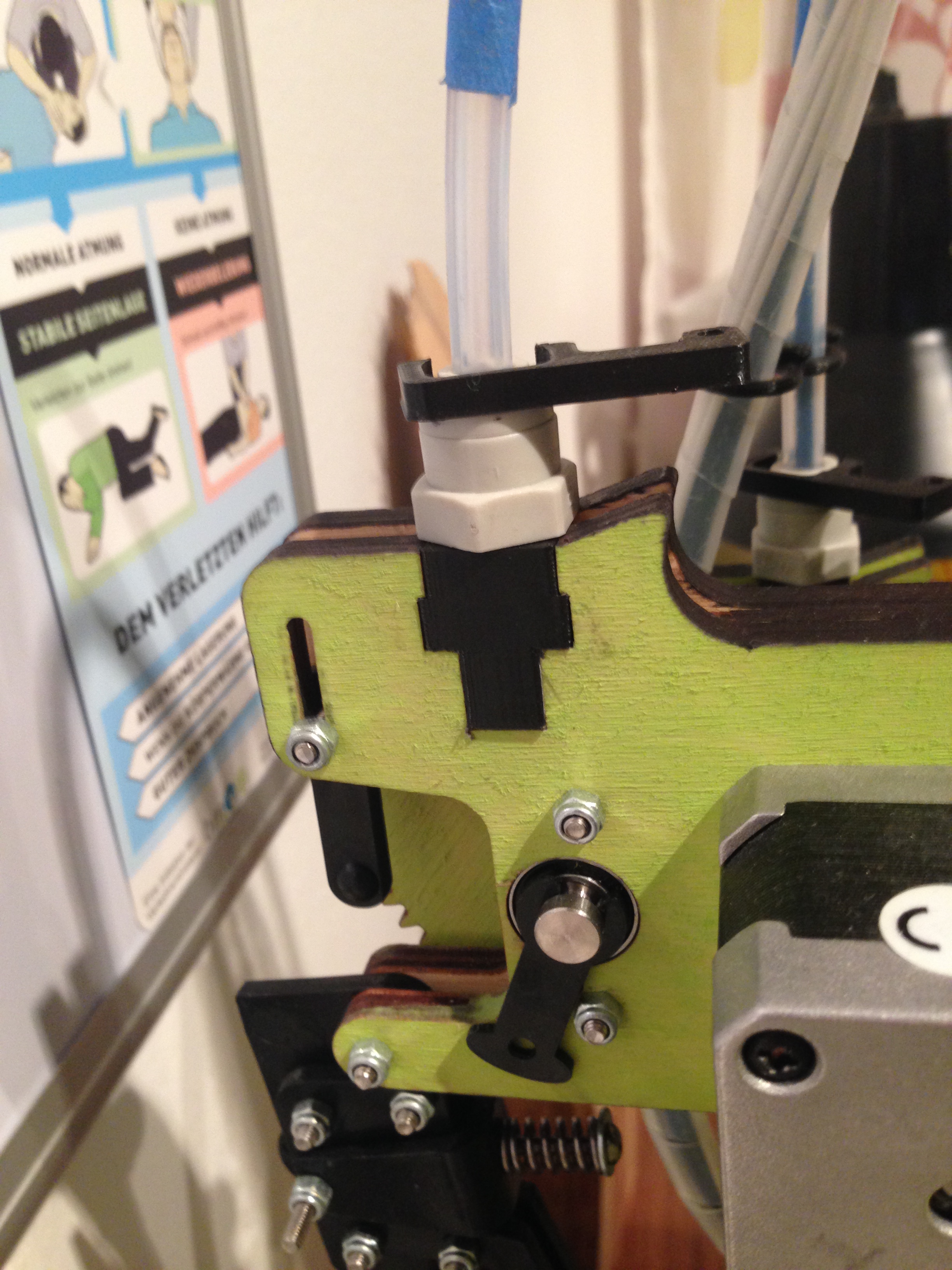 Screw this grey bowden coupler into the printed one (the black T-Nut at the picture) and push it in place into the ply.