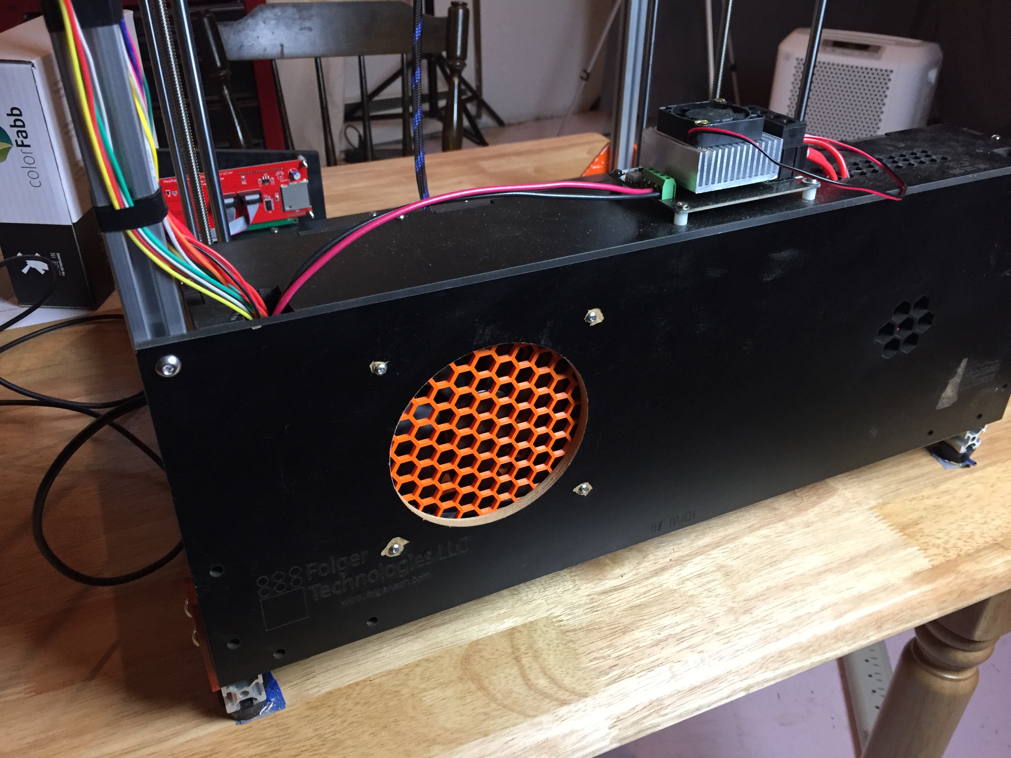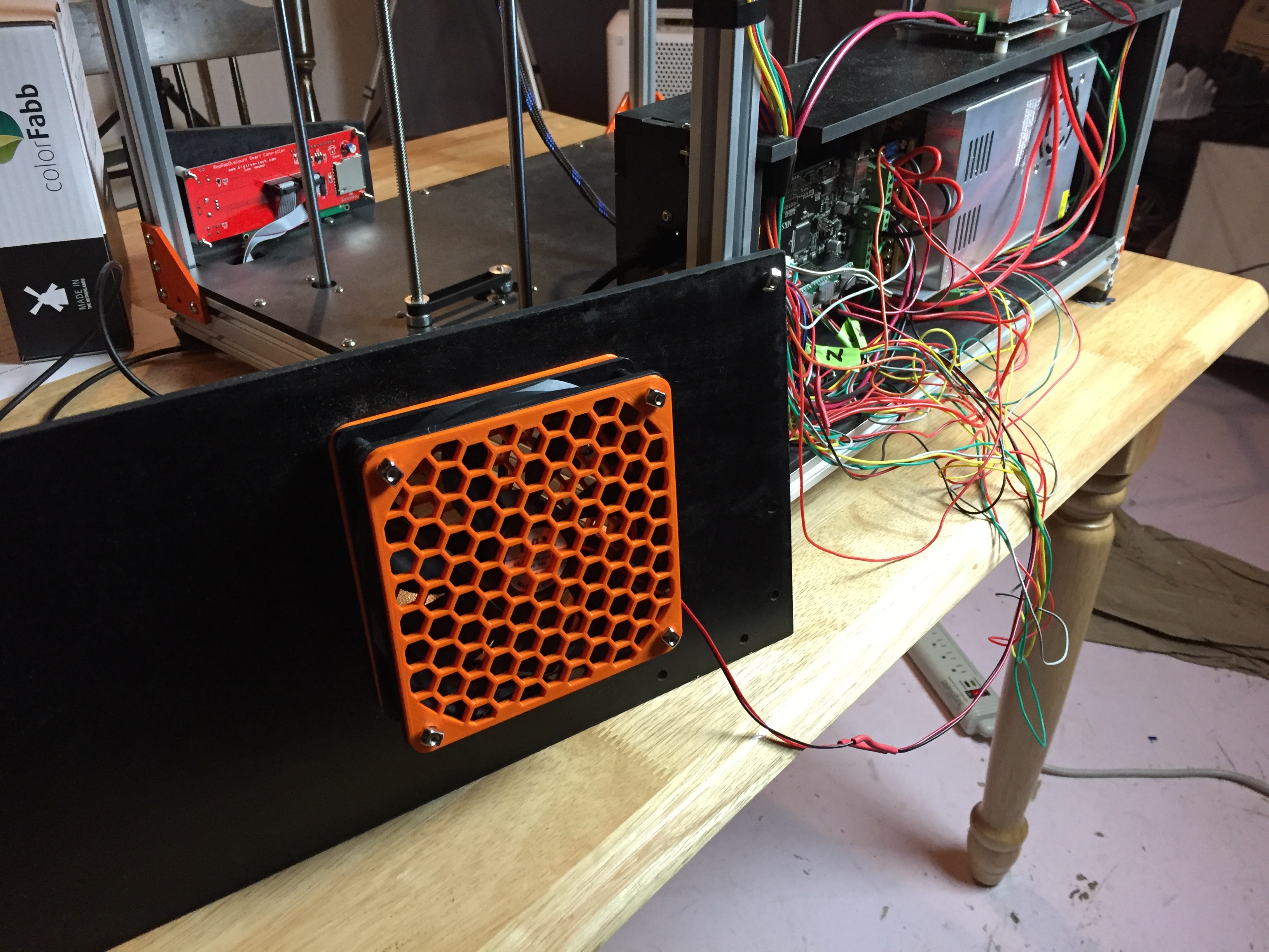 * One of the builders posted some before and after print pictures of without direct stepper driver cooling and with. It's an impressive image and showed great gains in details if the drivers have a steady cooling airflow on them. Following his lead, I have purchased a 120 mm case fan. I'll cut a large hole in the electronics rear door for it. That'll be a lot of airflow in there!
