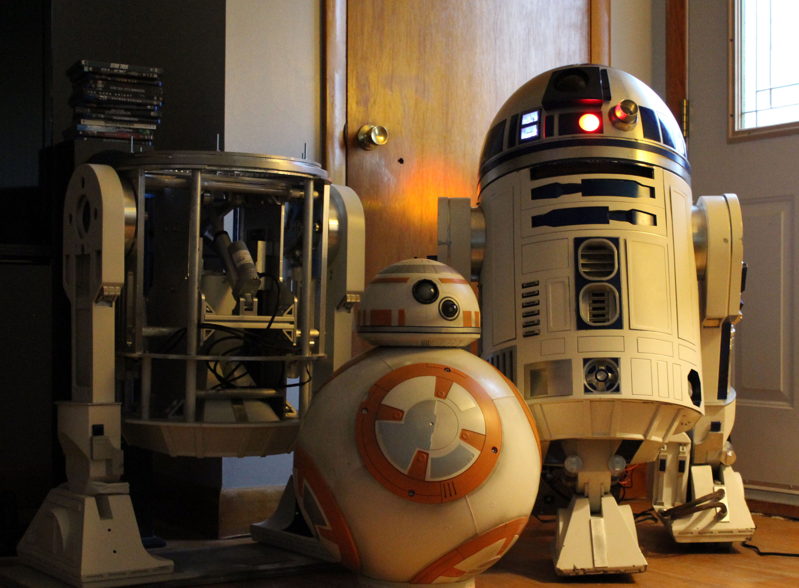...a friend one of these Target department store display BB-8's. No, not to the exact specs of the real thing but still really neat. She adores this little fella and asked if I could open it up and improve the noisy motor that moves the head. While looking it over, there are a lot of neat things I could do to improve this. Authentic BB-8 sound effects, maybe use an Arduino UNO and an MP3 shield....and a decent little speaker. It's funny since it has a motion sensor to trigger the sounds and motion. My cat keeps trying to sneak up on it but is quickly scared away!