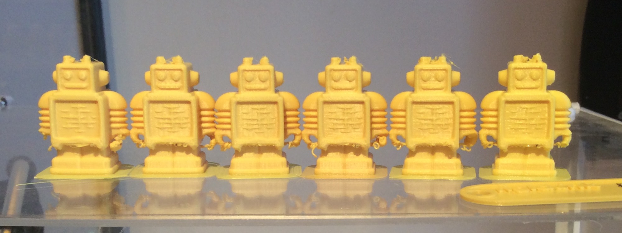 However as you can see from the photo below, the UMrobots are printed at 5' increases from left to right starting at 235' to 260', but the support for the hands has problems as do the antenna, they have all been printed at about 35mm/s with 10% fans just to keep the ducts cool and from warping.