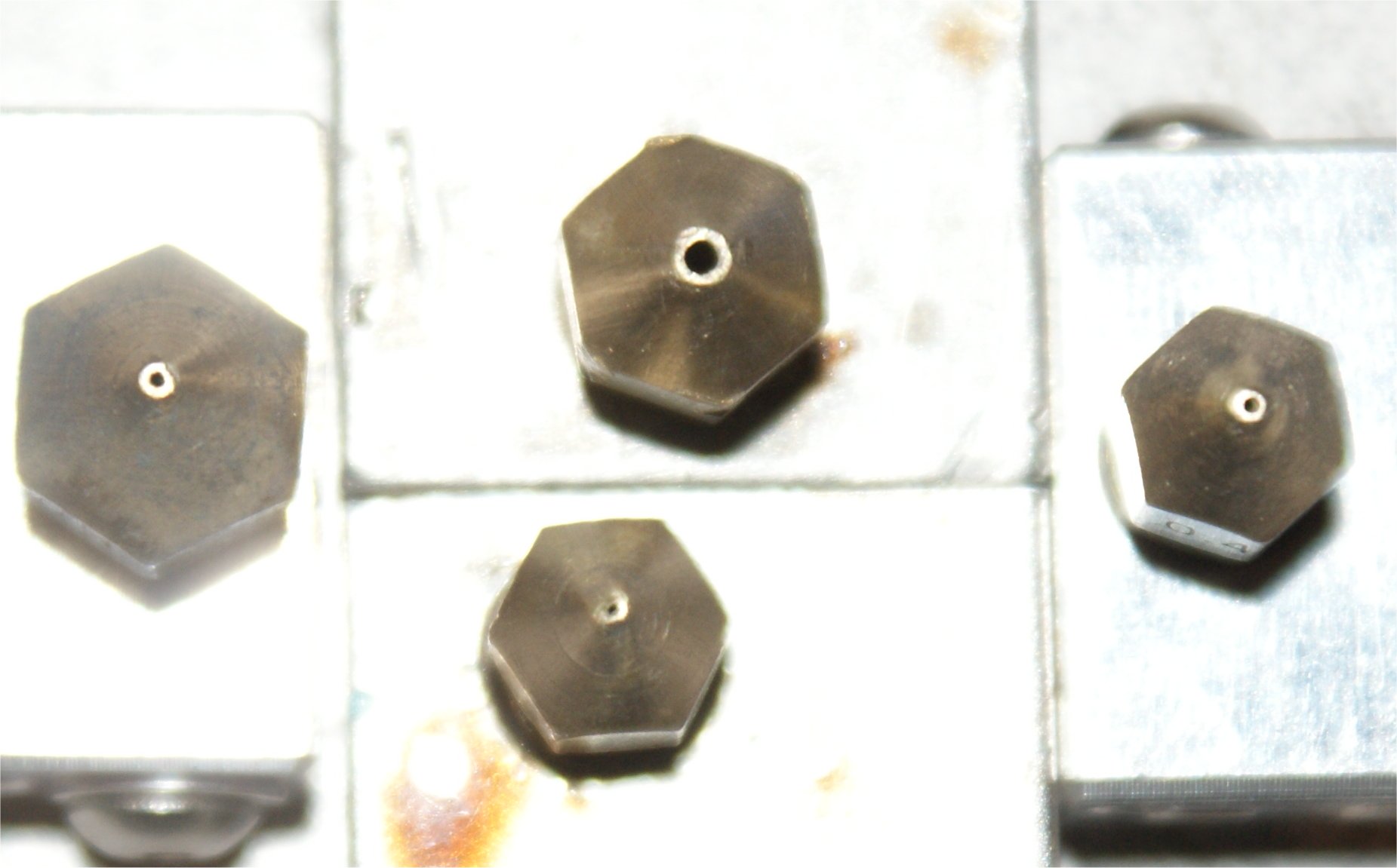 The lowest and left nozzles looks like it collided with the aluminum bed and could be fixed with the purchase of precision nozzle drill bits.