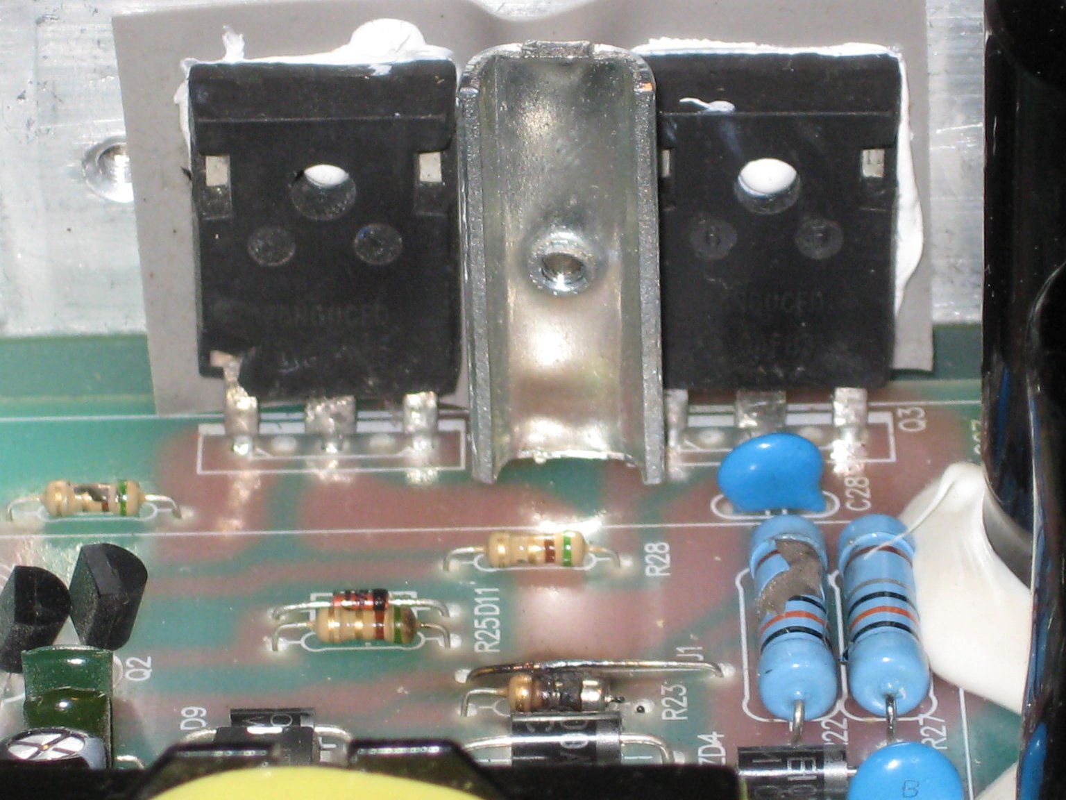 You can see in the photo that the left Mosfet left most leg has blown, and various resistors on the Photo.
