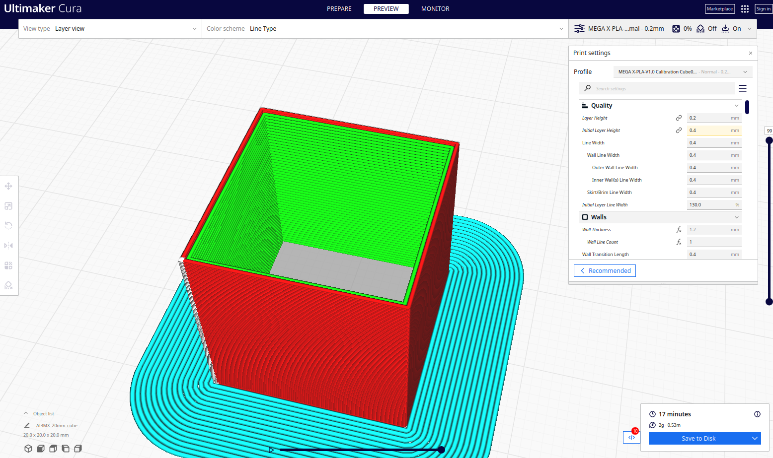 for calibration I want to print just 1 (red) wall of this cube but I only can see 2 walls in cura with my pfrofile.
