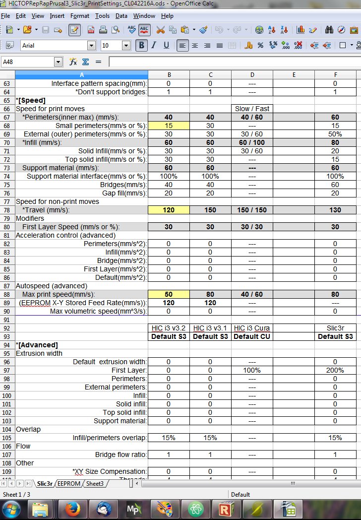 Just thought I would share my worksheet I use to track Slic3r, some Cura settings as I'm calibrating my machine, a HICTOP i3. It may come of use for other Slic3r and HIC i3 users, or even just those that need to record settings for any printer that uses mainly Slic3r and 'some' Cura, however you can update or change as necessary for your own use. It has helped me being fairly new at 3D printing to track my changes and keep my current settings in one place, I case I forget!