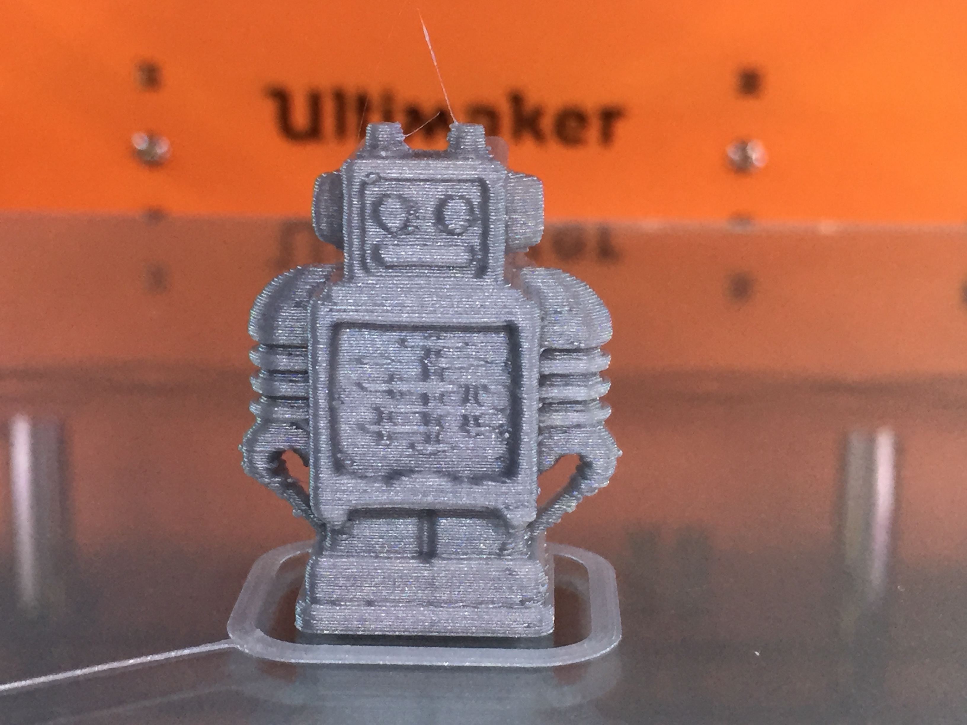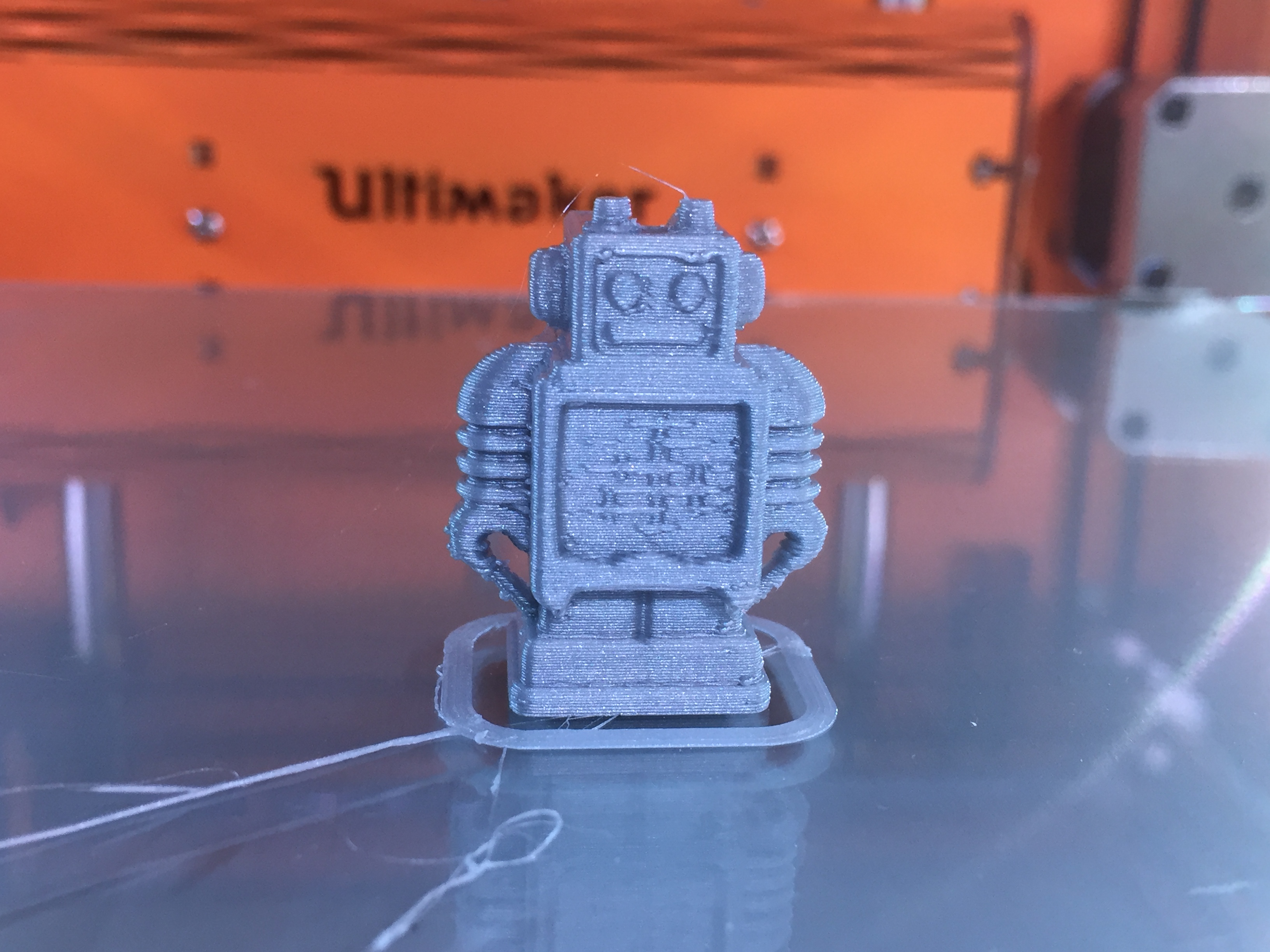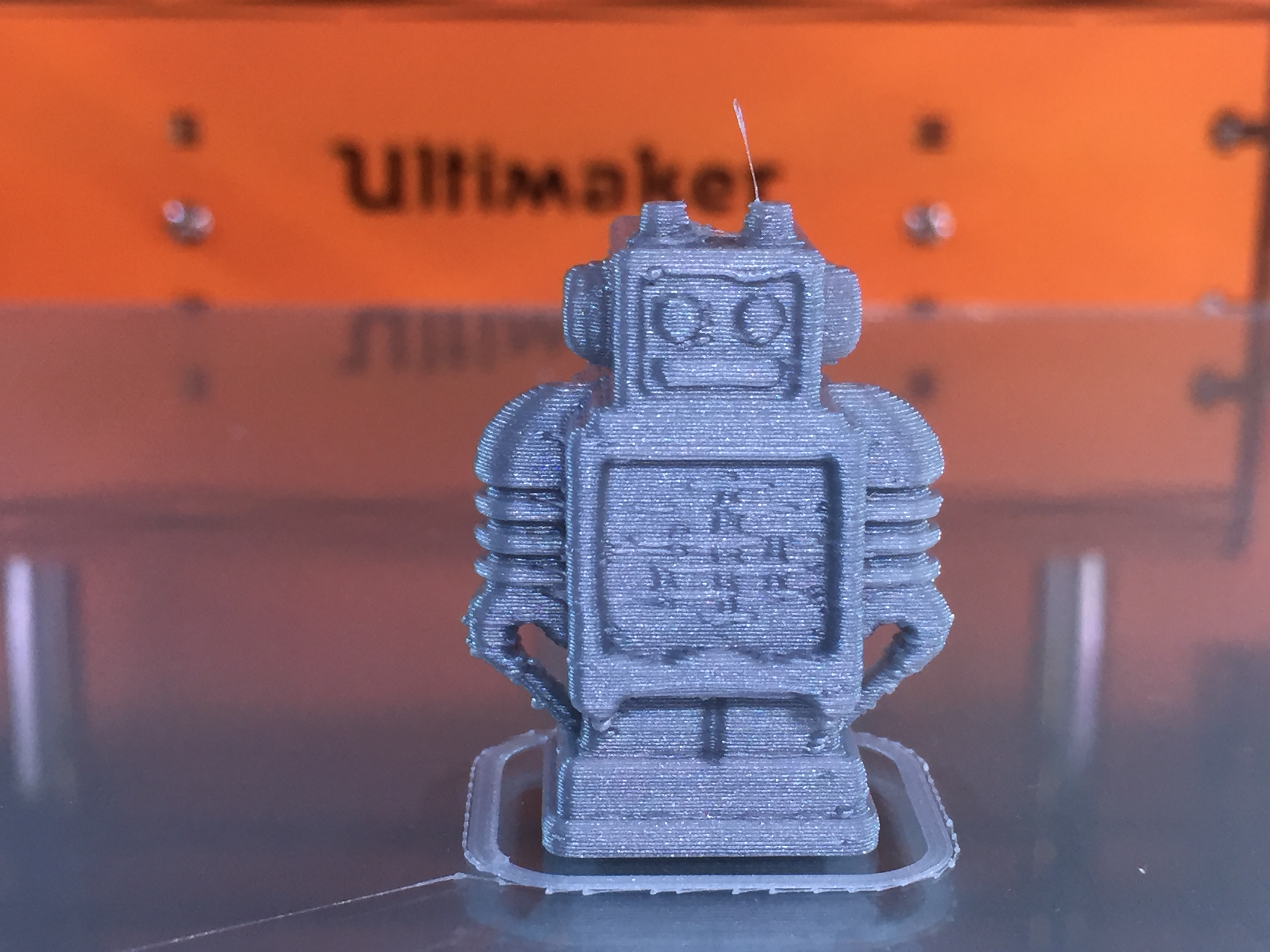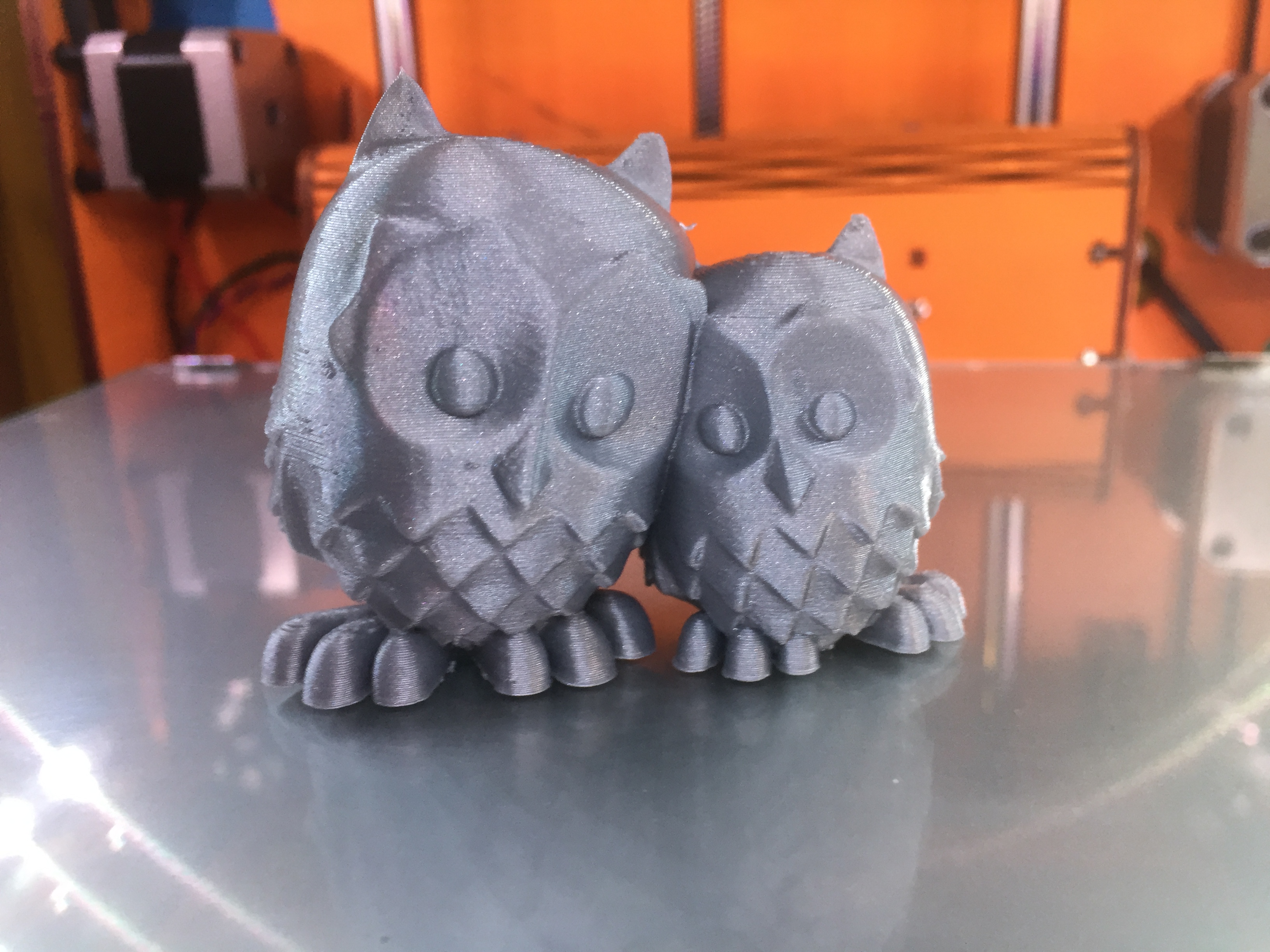 With that said, I did the robot with the same basic settings... 0.2 layers, 225C , bed at 60C, retraction at 45 mm/sec and 4.6mm distance....and it came out very nice! I decided to do a different print, this time the 2 owls one. Again, same settings but a tad more fan since we still have a little droop in the Ultimaker robot's chest. 3 hours to go!