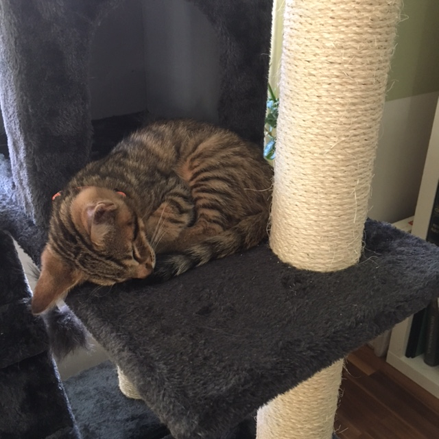 The drive home was a bit exhausting...but he found his place in the cat tree already..