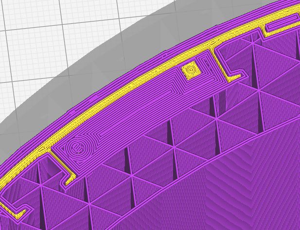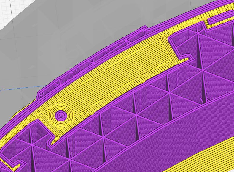 I'm having an issue where the support structure does not print under an overhang but does print under an overhang further up the z direction. I've included some images to help show what I'm trying to explain. The model .jpg shows the areas I'm referring to. The shape and thickness of the overhangs circled in red are the same. No support structure is printed underneath the bottom overhang except, for some reason, the portion of the bottom overhang that has the hole shown in 106, 109, 110. After layer 109, Cura goes right into generating the overhang at layer 110. As you move up the z direction the support structure is printed entirely for the top overhang as shown in the sequence images 275 and 277 which result in the first layer of the overhang 279. The top overhang is fully supported. How can there be no fully generated support structure for the bottom overhang but there is for the top? I've also included the .3mf file for debugging.