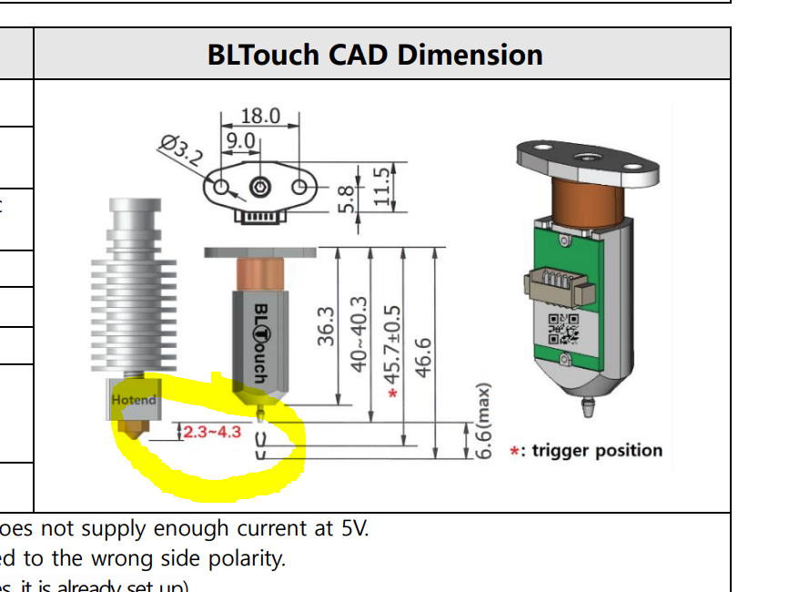 Now pay close attention to this part, look at the guidelines for the distance for the BL Touch tip in relation to the nozzle tip.